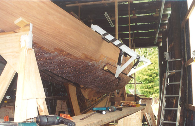 Starboard biew showing special white cramps made for the project. Note all screw and rivet holes have been counterbored and are dowel plugged. No filler is used.