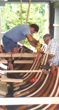 Peter Brookes and Colin Brookes are in the process of the two man job of fitting another steamed frame in position