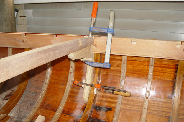 A hanging knee being set up for one of the deck beams. The beam shelf, laminated frames and steamed frames (ribs) riveted in place can be clearly seen