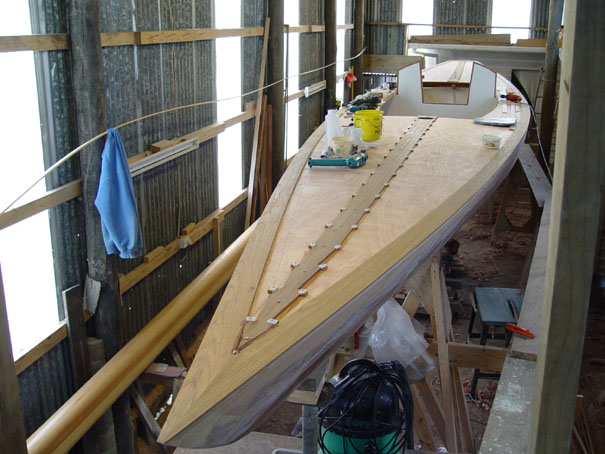 The covering boards are already laid and now the king-plank is held in place by the temp spacers