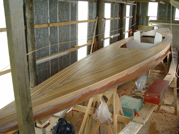 The teak decking has now been laid, with only the caulking needed to complete the process. In this view looking aft, the white cabin interior side of the bulkhead can be seen