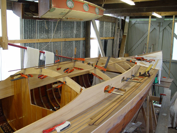 Looking forward, plywood patterns for the cabin-top beams are temporary clamped in place. Battens are being used to ensure a perfect continious curve is achieved