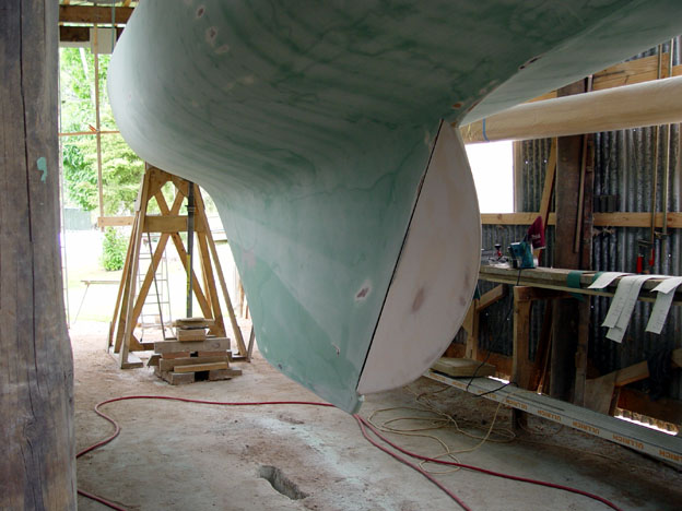 The boat is hung from the ends so that even under the keel can be properly faired and sanded