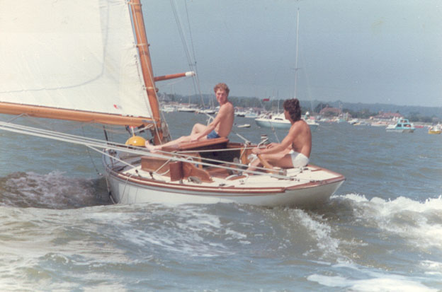 Her ease of handling is clearly visible in this close shot with Peter at the helm and friend and crew Stewart Tolfrey on the cabin-top