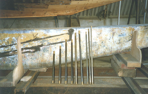 New keel-bolts have been made and the keel moved back under the boat ready for fitting